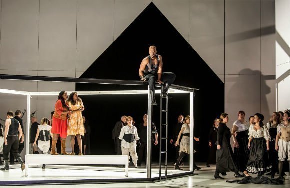 Surtitles system displays sung words above the stage.